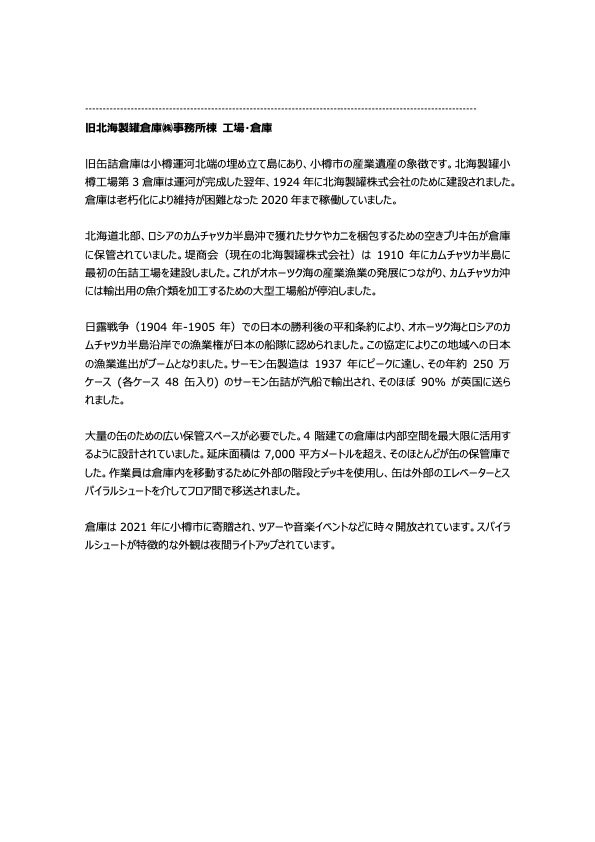 【集合場所】北海製罐(株)小樽工場 事務所棟1F会議室(小樽市色内3丁目1番1号) ※駐車場無料